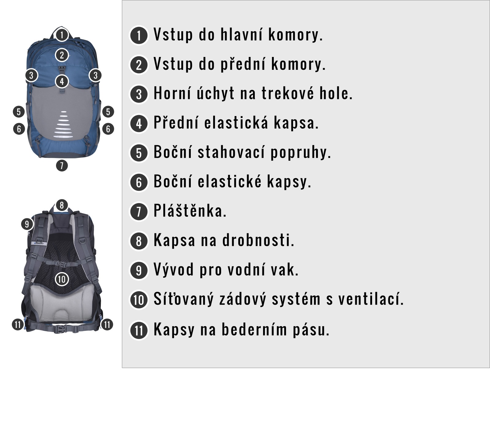 Skid má hned dvě výhody. Je menších rozměrů a jeho hmotnost je poměrně nízká. Proto si tento batůžek oblíbí zejména všichni cyklisté, kteří potřebují při svých výletech šetřit každý gram. Hodit se ale bude samozřejmě pro všestranné outdoorové aktivity, stejně jako pro nošení po městě. Batoh Skid má výjimečný design a zároveń je to pohodlný, odolný a spolehlivý model. Byl vyroben z kvalitních materiálů a je vybaven moderní konstrukcí, která zároveň zajišťuje bezvadné odvětrávání. Výbava batohu Skid: zádový systém NBS s duralovými výztuhami, prodyšné polstrování na anatomicky tvarovaných ramenních a bederních popruzích, 2 hlavní komory, kapsička na vrchu batohu, elastická přední kapsa a boční kapsy, boční kompresní popruhy, hrudní a bederní popruh, úchyt na trekové hole či jinou výbavu, příprava pro vodní vak, pláštěnka, reflexní prvky.