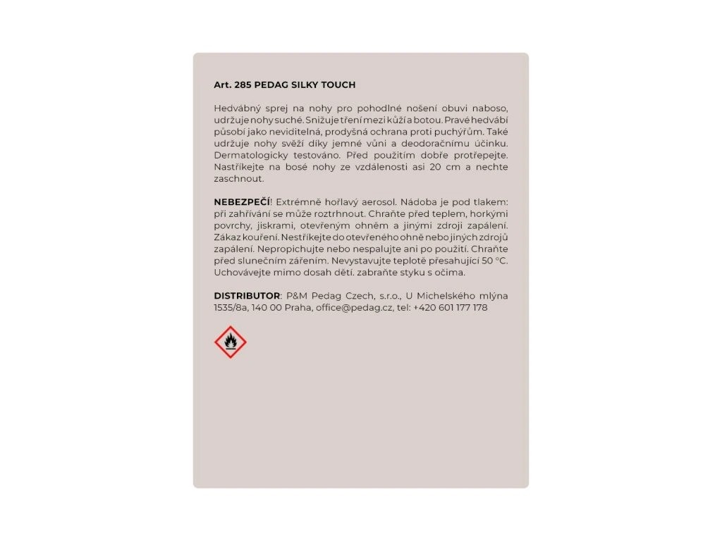 „Ukažte nohy…“ K letnímu vzhledu patří udržované nohy. Umně vystavené ve stylových sandálech přinášejí do našich zeměpisných šířek prázdninovou atmosféru. S rostoucími teplotami se však potí každá noha i v těch nejvzdušnějších sandálech. Malý pomocník, velký efekt: sprej na bosé nohy pedag Silky Touch hýčká pravým hedvábím a chrání nohu před třením jako neviditelná, prodyšná punčocha. Hedvábný sprej vytvoří kolem nohy jemnou vrstvu a udrží nohu hedvábně suchou i během nákupního maratonu. Ovocná grapefruitová vůně hedvábného spreje se postará o svěžest nohou po celou dobu. Mimochodem: malý a praktický sprej na bosé nohy je ideálním společníkem na cesty, který se zaručeně vejde do každého kufru. Pro příjemně suché nohy s okouzlující vůní kdykoli a kdekoli. udržuje nohy suché a svěží chrání před třením a puchýři s pravým hedvábím pečující a šetrné k pokožce svěží vůně grapefruitu dermatologicky testováno