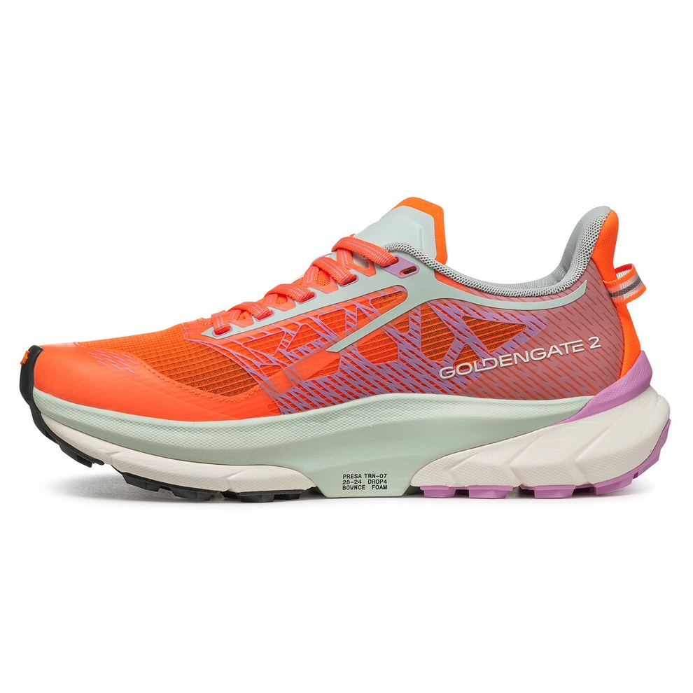 Golden Gate 2 ATR je mimořádně všestranný dámský model, tato multi-terénní bota je určená na střední a dlouhé tratě. Ve srovnání s předchozí verzí je svrchní materiál odolnější a prodyšnější. Nová mezipodešev z pěny Bounce Foam poskytuje pružnější odezvu a šetří energii. Geometrie podrážky I-Respond systém o dvojí hustotě pěny umožňuje hladší a více efektivnější krok. Prodyšný textilní svršek, který je vyrobený bezešvou technologii EXOskeleton, díky tomu je noha v botě velice stabilně a bezpečně „uložena“ Díky konstrukci Sock-Fit LW obepíná svršek nohu stejně dokonale jako ponožka. Jsou tak eliminovány tlakové body a zajištěno maximálního pohodlí a přesnost. Vysoká ochrana před náhodnými nárazy díky měkké pryži na špičce. Vysoká přilnavost a trakce v každém terénu včetně asfaltu díky podrážce Presa® TRN-07. Samotná podrážka je zónově řešená pro terén i silnici. Systém i-Respond zlepšuje fázi odrazu pro úsporu energie. Díky těmto klíčovým vlastnostem se skvěle hodí pro sportovce s jakoukoli hmotností a úrovní zkušeností, kteří vyhledávají spolehlivou a pohodlnou obuv pro svůj každodenní běh.Boty vyrobené rodinnou firmou SCARPA z Itálie, která se věnuje výrobě obuvi od roku 1938. NAŠE TIPY: Jak si vybrat boty. Jak se starat o boty