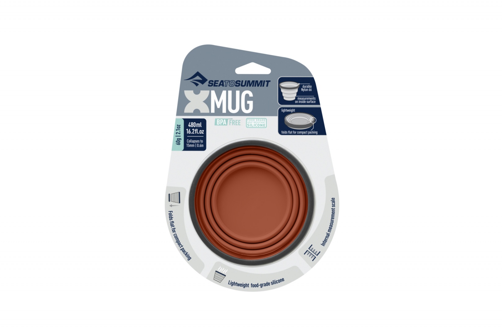 X-Mug je vyroben z pružného silikonu potravinářského stupně vyhovujícího evropským standardům. Zdvojnásobte velikost X-Cupu, X-Mug pojme spoustu pití. Tuhý kroužek uvnitř ráfku udržuje pevný a snadno se vypije, ale stále umožňuje, aby byl šálek rozložen na plochý disk, který se vejde téměř kdekoli.